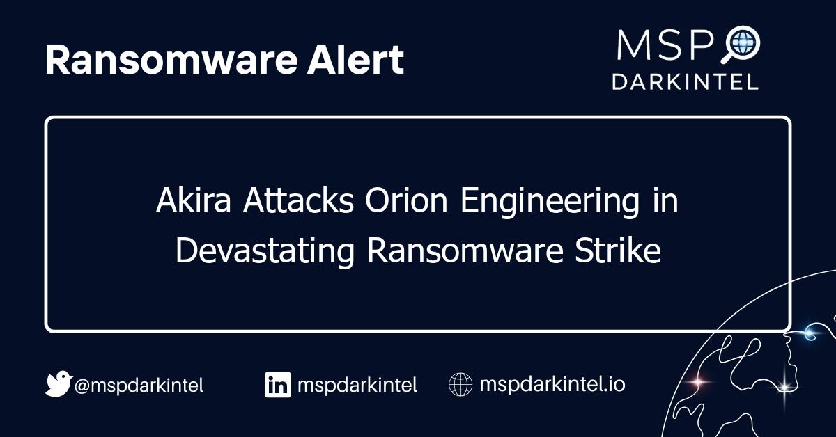 On October 6, 2025, the ransomware group Akira publicly claimed responsibility for an attack targeting Orion Engineering, a U.S.-based company in the agriculture and agribusiness sector. The threat actors have threatened to release 32GB of sensitive data unless their demands are met.