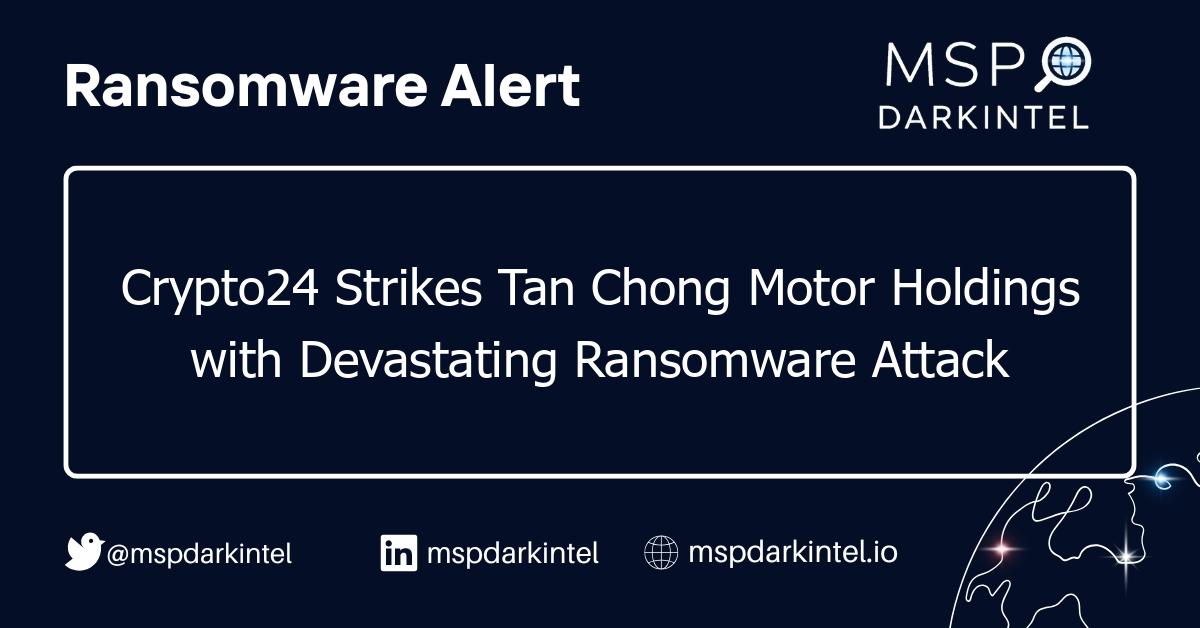On July 16, 2025, the ransomware group Crypto24 publicly claimed responsibility for an attack targeting Tan Chong Motor Holdings Berhad (tanchonggroup.com), a Malaysian company in the automotive sector. The threat actor has exfiltrated over 300GB of sensitive data, including customer databases, legal and HR documents, financial and employee records, and contractual documents. The group demands negotiation to prevent the public release of this data.