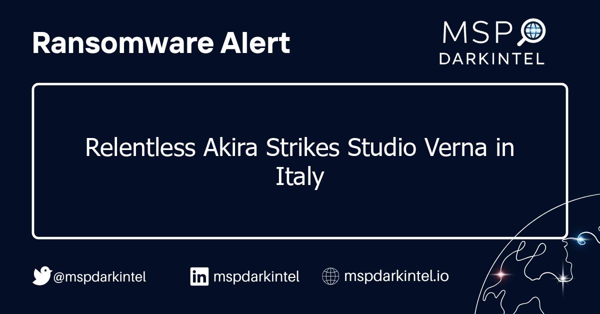 On June 26, 2025, the ransomware group Akira publicly claimed responsibility for an attack targeting Studio Verna Società Professionale, an Italian firm offering integrated economic, tax, and legal advice. Akira threatens to release over 7GB of sensitive data unless negotiations are initiated.